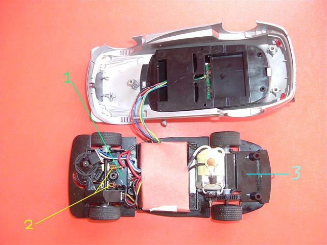 The motor wires 3 are, however long enough to connect to the wires that would usually serve the inner workings of the car (connected to 2 in the first pic).